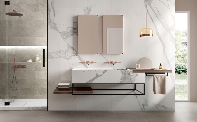 9、在衛(wèi)浴間的瓷磚設(shè)計上可以利用線條去打造長度和寬度,可以把瓷磚橫著貼來拉寬衛(wèi)浴間的視覺效果,讓衛(wèi)浴間看起來會更大一些。